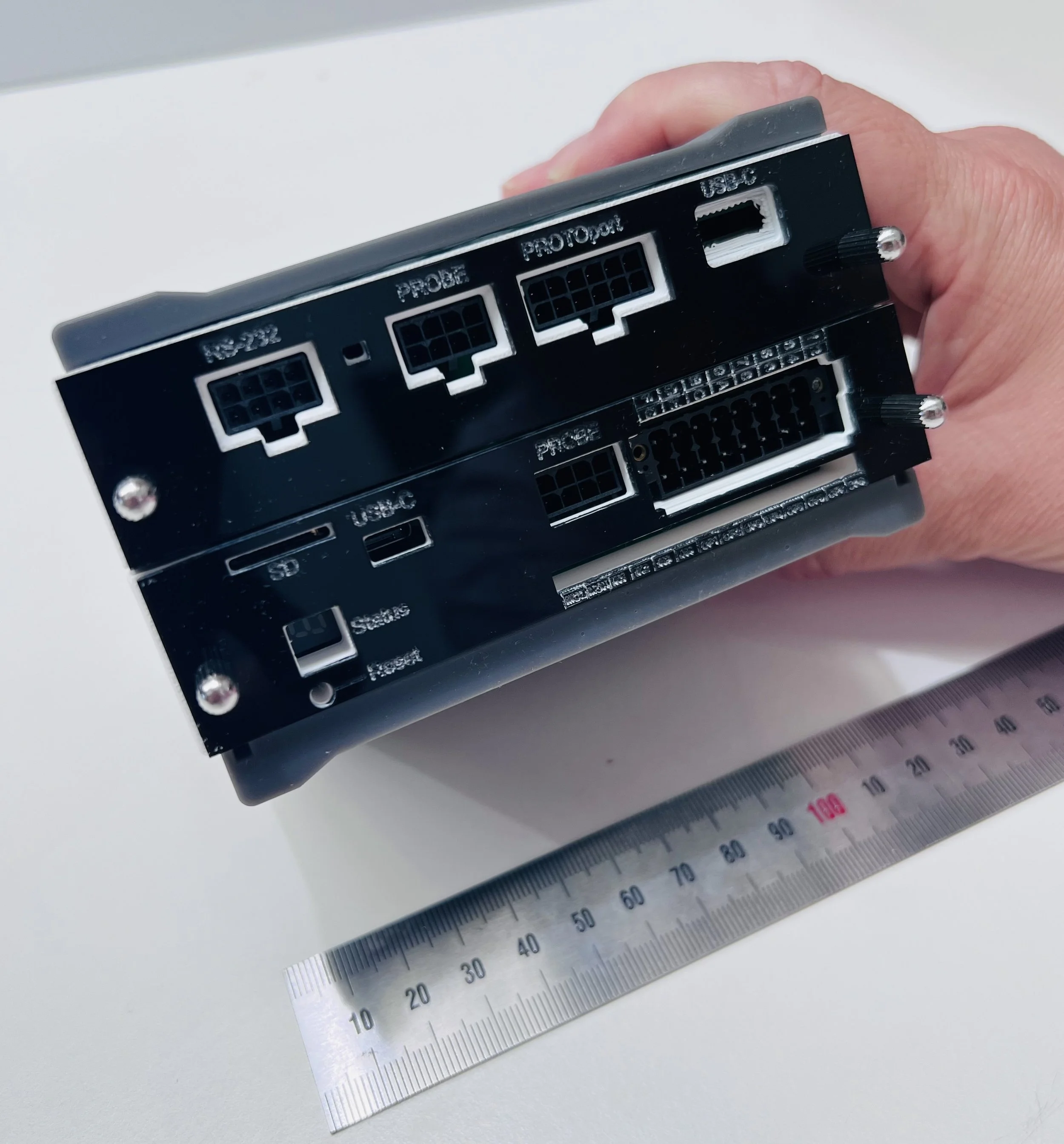 Eddie Data Hub - 2 slot version. Note ruler and hand for size comparison.