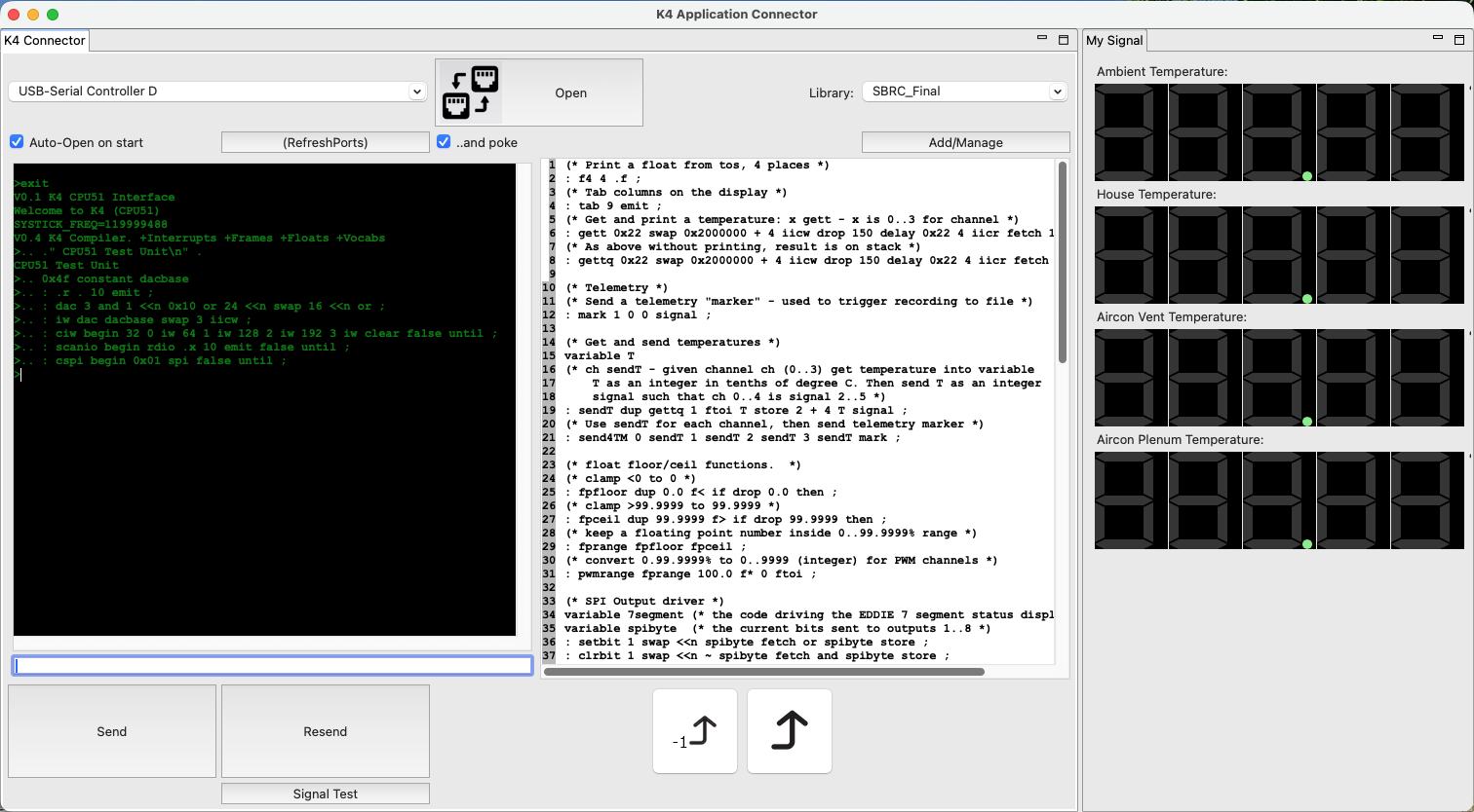 temperatures are signalled to the KAT terminal (n.b. this is the IDE we created for this application) and displayed on a dashboard. Signals are a unique part of the K4 system that allow components to message any other components and further out into host computers and wide area networks. Signals can be encapsulated in other messaging transports like HTTP, MQTT or 0MQ etc.