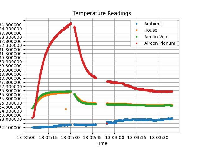 This word switches the aircon to heat at full power. The fans are turned on automatically by the software when doing this. At around 2:30 in the graph above, we interrupted the ‘acquire’ loop and executed: